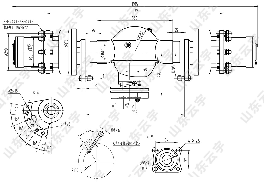 ● 制动器为涨蹄式,制动可靠,操纵灵活。